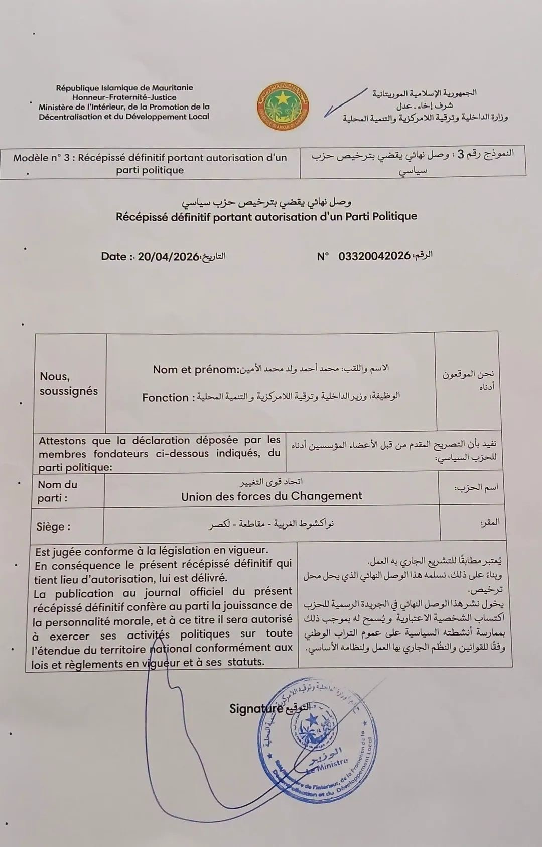 أعلن حزب اتحاد قوى التغيير عن حصوله على الترخيص النهائي، في خطوة وصفها رئيسه المهندس المختار ولد الشيخ بأنها تتويج لمسار من العمل الجاد والنضال المسؤول.
